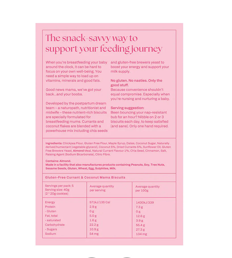 Currants and coconut flakes are blended with a powerhouse mix including chia seeds, almond meal and gluten-free brewers yeast to boost your energy and support your milk supply.