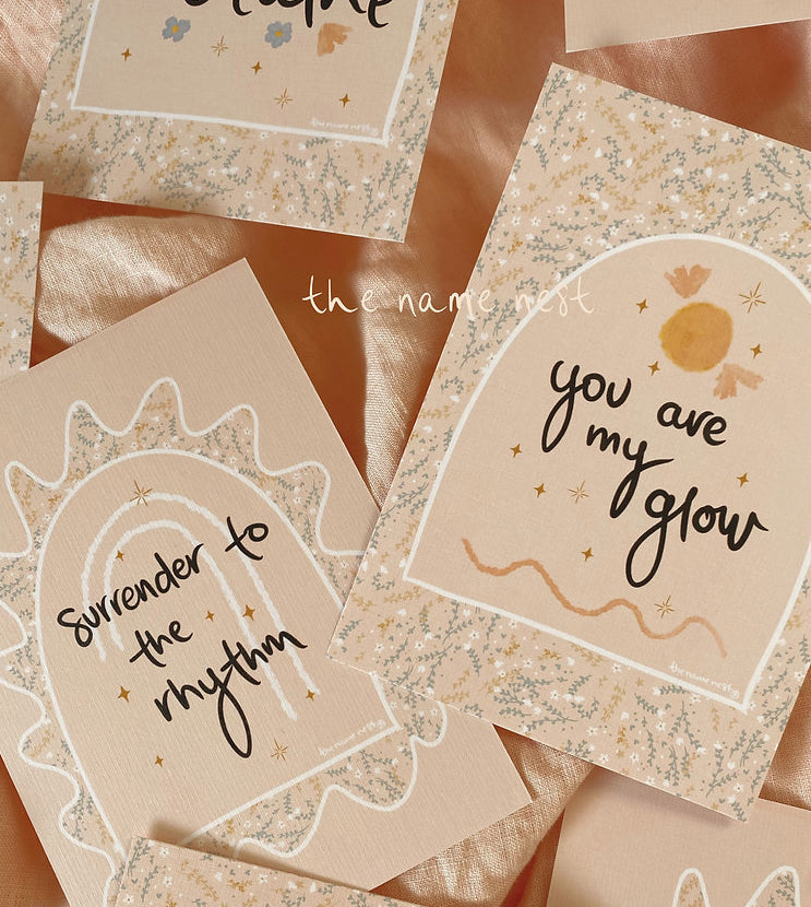 Each deck contains 10 beautiful double sided linen cards, featuring 19 empowering and positive affirmations to use in your pregnancy and birthing journey. It also features a little wooden card stand to display your card of choice and a little cardboard window box to keep your deck together.